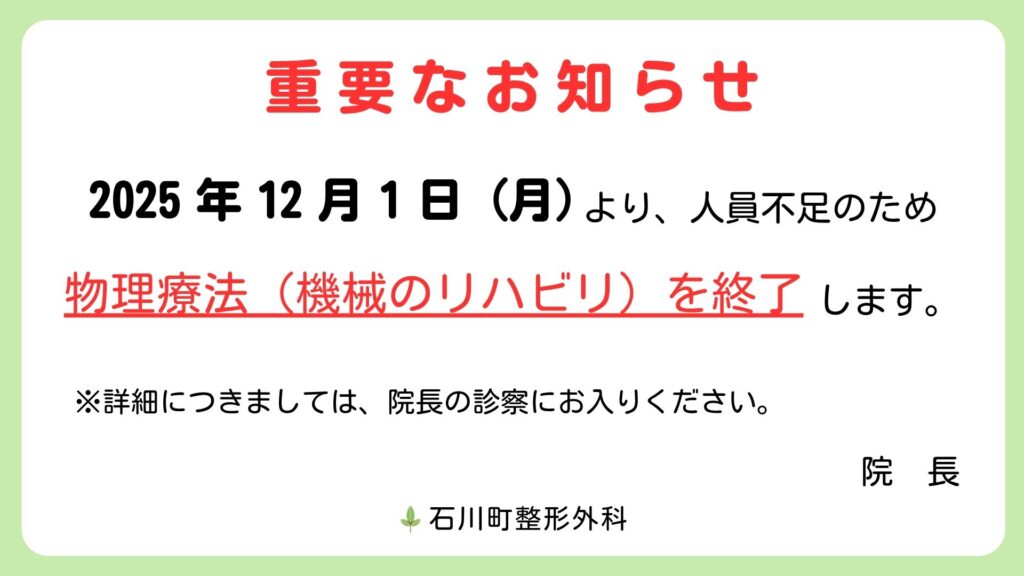 物理療法終了のお知らせ(2025年12月1日より) 2025/11/15 石川町整形外科 いつも当院をご利用いただき、誠にありがとうございます。このたび、人員不足のため、2025 年 12 月 1 日(月)より物理療法(機械によるリハビリ)を終了させていただくことになりました。 現在、物理療法をご利用いただいている皆さまには、ご不便をおかけすることとなり大変申し訳ございません。今後の治療方針や代替のリハビリにつきましては、院長の診察にてご相談ください。 患者さまがこれからも安心して受診いただけるよう努めてまいります。何卒ご理解のほどよろしくお願い申し上げます。