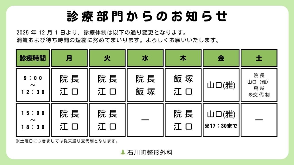 診療体制変更のお知らせ(2025年12月1日〜)※石川町整形外科